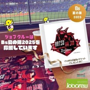 お知らせ 2025.08.04 『Bs夏の陣2025』を応援しています。 昨年に引き続き オリックス・バファローズのイベントに協賛させていただくこととなりました。 ジョブクルーは、7月29日からの『Bs夏の陣2025』を応援しています!